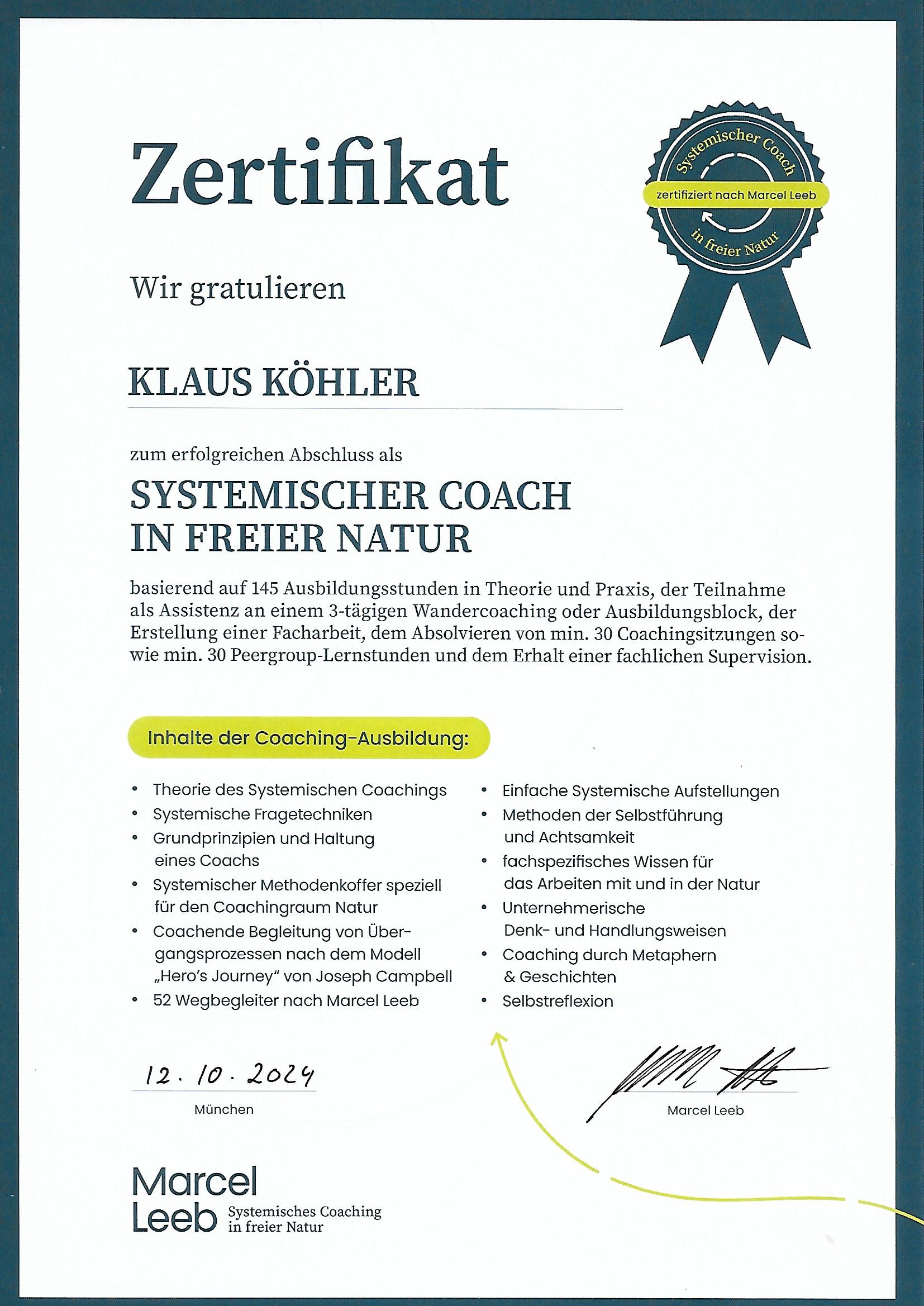 Damit ich den vielfältigen Herausforderungen bei der Arbeit mit Menschen noch besser gerecht werden kann, habe ich eine sehr umfangreiche Ausbildung absolviert. Als Systemischer Coach in freier Natur unterstütze ich meine Klientinnen und Klienten durch professionelles Coaching dabei, ihre eigenen, individuellen Lösungskompetenzen zu erkennen und weiter zu entwickeln.